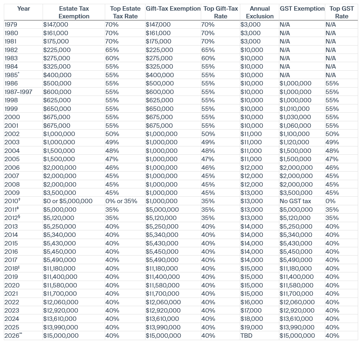 ** The One Big Beautiful Bill Act (“OBBBA” or “OB3”) increased exemptions to $15,000,000 beginning in 2026 to be indexed for inflation in future years. The annual exclusion amount for 2026 has yet to be announced.