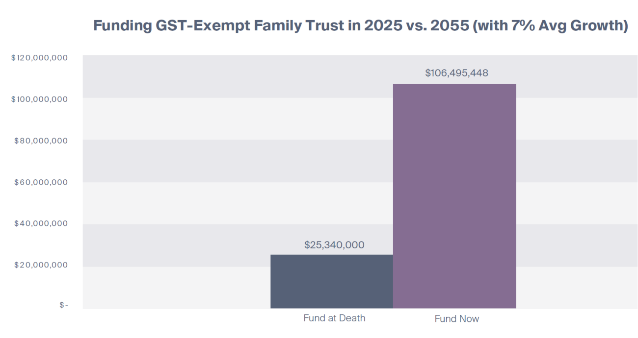 FIGURE 2: FUNDING GST-EXEMPT FAMILY TRUST IN 2025 VS. 2055 (WITH 7% AVERAGE GROWTH)
